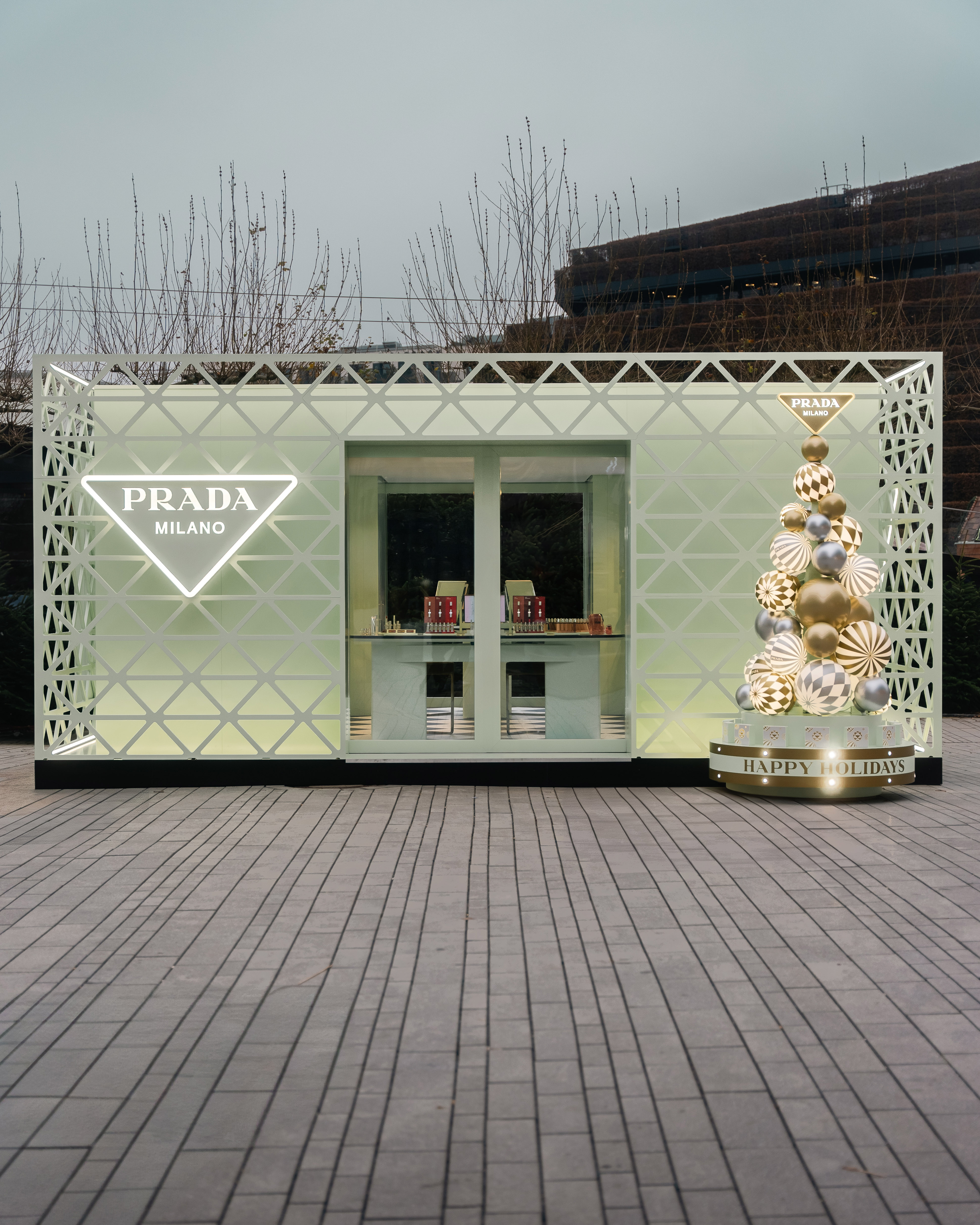Im Zentrum von Düsseldorf wurde ein 7 x 7,5 m großer Pop-up Store realisiert, der zwei Wochen lang für starke Markenpräsenz sorgte. Besucher:innen konnten die Paradoxe Düfte entdecken, sich am Triangle Make-up-Tisch professionell schminken lassen und die Marke in stilvoller Atmosphäre erleben. Ergänzend dazu setzten Prada-Weihnachtsbäume in Düsseldorf, Genf, Wien und weiteren Standorten überregionale Akzente – und machten die Kampagne in der gesamten DACH-Region sichtbar.